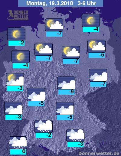 In der Nacht zum Montag zeigt sich der Himmel über dem Norden oft stark und sonst locker bewölkt. Über der breiten Landesmitte ist es teils stark, teils aufgelockert bewölkt, im Süden weitestgehend dicht bewölkt. Im Alpenvorland fällt zeitweise Schnee, sonst bleibt es landesweit trocken bei Tiefstwerten von 0 Grad in Freiburg und bis -9 Grad im Thüringer Becken.