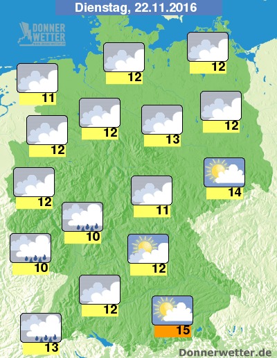 Heute sind im Süden und Osten heitere Abschnitte möglich, häufig ist es jedoch auch stark bewölkt, dazu aber trocken. Im übrigen Bundesgebiet halten sich hingegen meist dichte Wolken, dazu fällt im Südwesten und teils auch im Westen des Landes gebietsweise Regen, in den anderen Regionen bleibt es mehrheitlich trocken. Die Temperatur erreicht recht milde 10 bis 15 Grad.