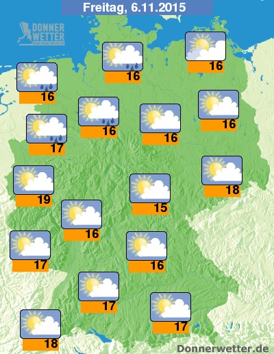 Am Sonntag überwiegend im Norden dichte Wolken mit teils längeranhaltendem Regen, über der breiten Landesmitte ist es wechselnd oder stark bewölkt, jedoch weitgehend trocken. Am freundlichsten mit häufiger auch heiteren Abschnitten ist es in Süddeutschland, hier bleibt es trocken. Die Temperatur erreicht 13 Grad an der Ostsee und bis 20 Grad im Oberrheingraben.
