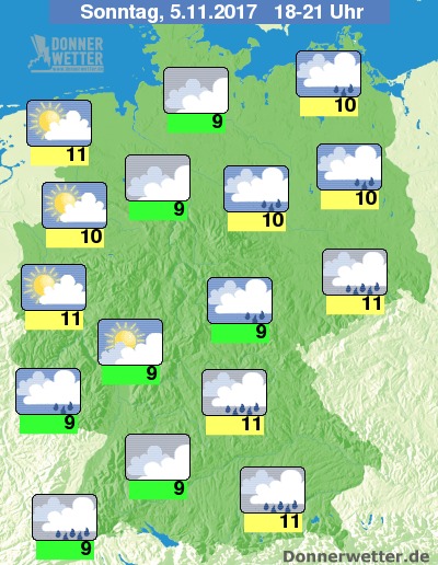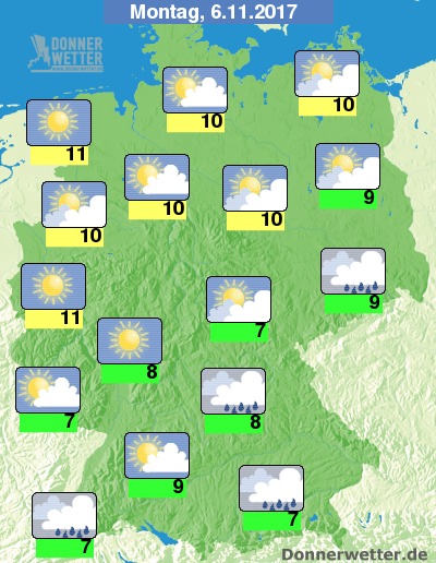 Am Montag bleibt es über dem Süden und Osten meist wolkenverhangen, besonders im Südosten, jedoch auch im übrigen Alpenvorland und über Sachsen fällt zeitweise Regen. Über der Nordwesthälfte der Republik ist es hingegen überwiegend heiter bis sonnig und trocken. Die Temperatur erreicht nur 7 bis 11 Grad.