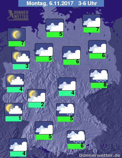 In der Nacht zum Montag fällt im Süden und Osten weiterhin zeitweise Regen. Über der übrigen Südosthälfte und dem Norden des Landes bleibt es stark bewölkt, jedoch trocken. Oft nur locker bewölkt oder sogar sternenklar zeigt sich der Himmel vom Saarland, über Rheinland-Pfalz, das westliche NRW bis zum Emsland, dazu ist es ebenfalls trocken. Die Temperatur sinkt auf 8 Grad in Dresden und bis 1 Grad im Saargau.