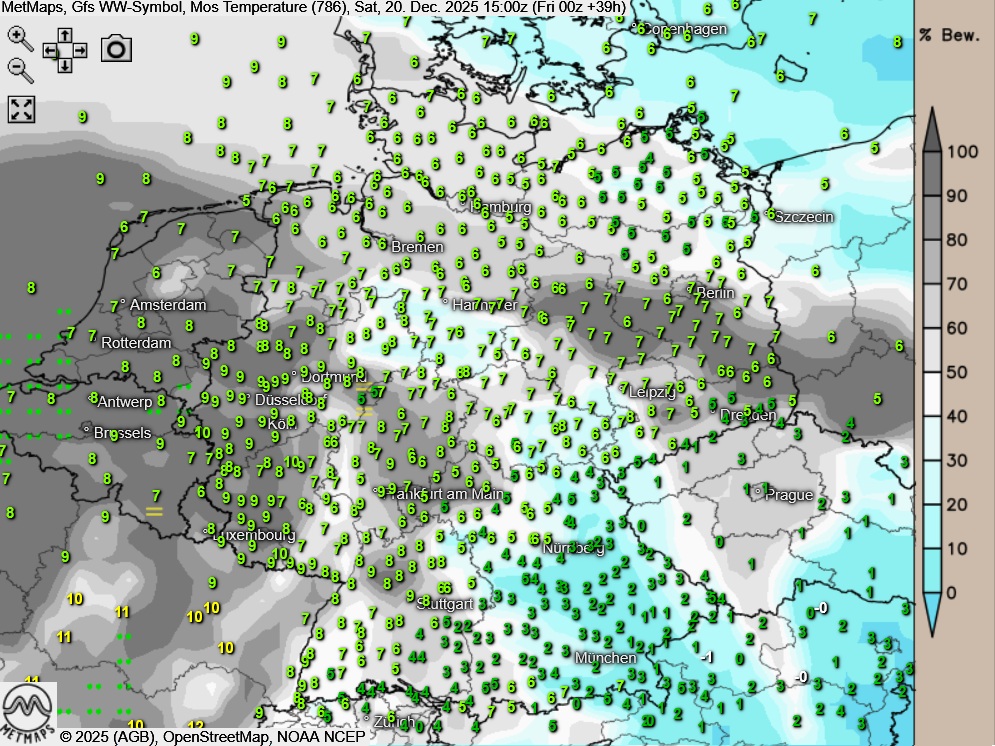 Am Samstagnachmittag zeigt sich der Himmel über weiten Landesteilen stark bewölkt, in der Südosthälfte kann sich am Nachmittag neben größeren Aufheiterungen auch zäher Nebel oder Hochnebel halten. Längere freundliche Phasen gibt es zudem im Alpenumland sowie in den Höhenlagen der Mittelgebirge. Im Westen kann zeit- und gebietsweise etwas Regen fallen, sonst bleibt es meist trocken.