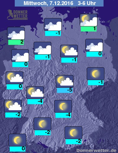 In der Nacht zum Mittwoch werden die Wolken im Norden dichter, teils ist es hier aber auch noch aufgelockert bewölkt. Im Westen und in der Landesmitte nehmen die Wolkenanteile ebenfalls etwas zu. Überwiegend sternenklar oder locker bewölkt zeigt sich der Süden Deutschlands sowie Sachsen. Trocken bleibt es jedoch bei Tiefstwerten zwischen 2 und -5 Grad überall.