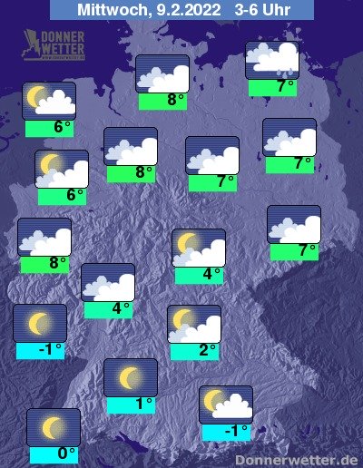 In der Nacht zum Mittwoch klart der Himmel über dem Süden häufig auf. Im übrigen Land bleibt es zumeist dicht bewölkt, wobei im Laufe der Nacht auch regional Auflockerungen möglich sind. Im Ostseeumfeld fällt gebietsweise Regen, sonst bleibt es trocken. Die Temperatur sinkt auf 8 Grad in Hannover und -1 Grad in Augsburg. An der See weht ein teils stürmischer Wind.