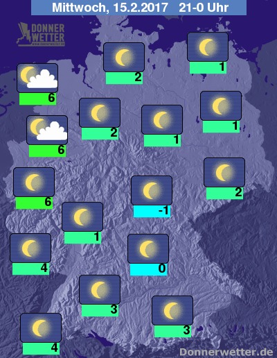Auch am späteren Abend weiterhin sternenklar. Nur Richtung Ems- und Münsterland können sich vereinzelte Wolken bilden. Die Temperaturen sinken auf 6 Grad C am Niederrhein und auf minus 1 Grad C im Thüringer Bergwald.