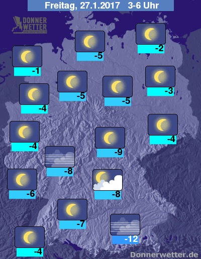 Im Lauf der Nacht fällt das Quecksilber allerdings landesweit in den Keller. Mit Tiefstwerten nur knapp unter dem Gefrierpunkt bleibt es an den Küsten vergleichsweise mild, im Süden sind hingegen auch zweistellige Minusgrade möglich. In den Morgenstunden bildet sich stellenweise Nebel.