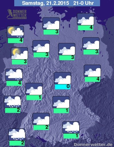 Heute Abend lockert die Bewölkung nach Nordwesten hin häufig auf und es bleibt mit Ausnahme der küstennahen Regionen meist trocken, ansonsten halten sich hingegen überwiegend dichte Wolken, wobei sich die Niederschläge in Form von Regen, Schneeregen oder Schnee weitgehend auf den äußeren Westen, Südwesten und das Alpenvorland beschränken, dabei kann es durch Schneefall besonders im Süden oft glatt auf den Straßen sein. An der Ostsee weht anfangs noch ein teils starker Wind. Die Abendwerte liegen bei 4 Grad am Niederrhein und etwa 0 Grad im Vogtland.