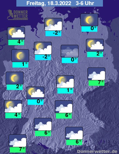 In der Nacht auf Freitag bleibt der Himmel zwischen dem südlichen Schwarzwald und Ostbrandenburg bedeckt; abseits davon ist der Himmel teils locker oder aufgelockert bewölkt, teils sternenklar. Gebietsweise kann sich Nebel bilden.