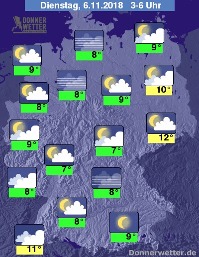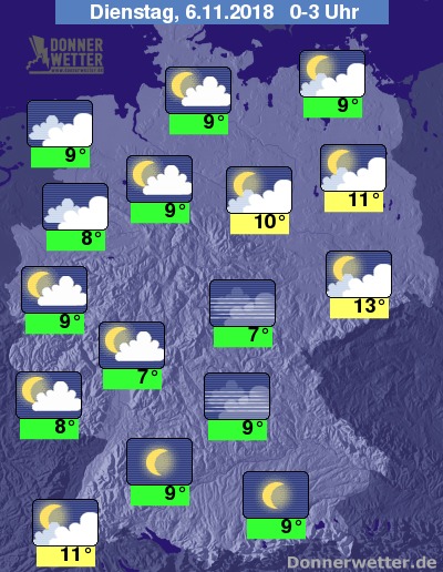 In der Nacht zeigt sich der Himmel über weiten Landesteilen locker oder aufgelockert bewölkt, im äußersten Nordwesten sowie später auch im Südwesten bleibt der Himmel auf teils bedeckt. Regional kann sich Nebel bilden, Schauer sind in der Nacht nicht zu erwarten.