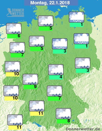 Am Montag bleibt es im gesamten Bundesgebiet bedeckt und es fällt zeitweise, besonders im Süden oft langanhaltender Regen. Im Osten und Nordosten der Republik fällt der Niederschlag bis zum Nachmittag meist als Schnee, er geht zum Abend hin aber allgemein in Regen oder Schneeregen über. Es besteht vielerorts Glättegefahr! Die Temperatur erreicht 1 Grad an der Müritz und bis 11 Grad in Stuttgart.