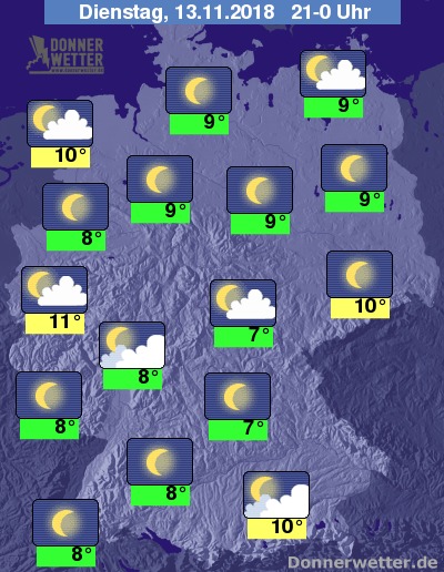 Vor Dämmerungsbeginn liegen die Temperaturen bei milden 11 bis 15 Grad, am wärmsten bleibt es dabei um München herum.