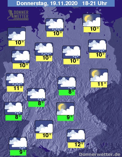 Am Abend breiten sich Regengüsse von Nordwesten Richtung Landesmitte aus. Diese können örtlich auch kräftig ausfallen und von Blitz und Donner begleitet sein. Teilweise mischen sich auch Graupelkörner unter die Tropfen. An den Alpen fällt Stauniederschlag. Dazwischen gibt es eine trockene Zone mit einigen Aufheiterungen.