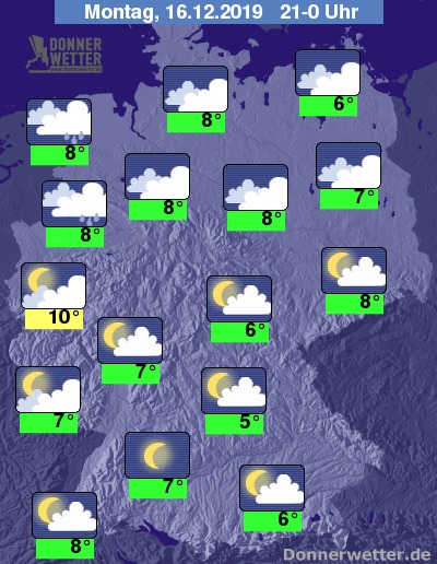 Am Abend bleibt der Himmel über dem Norden des Landes bedeckt und zeitweise fällt Regen, der in den späten Abendstunden aber zunehmend abschwächt. Im Süden ist es in den nächsten Stunden überwiegend locker oder aufgelockert bewölkt und es bleibt trocken.