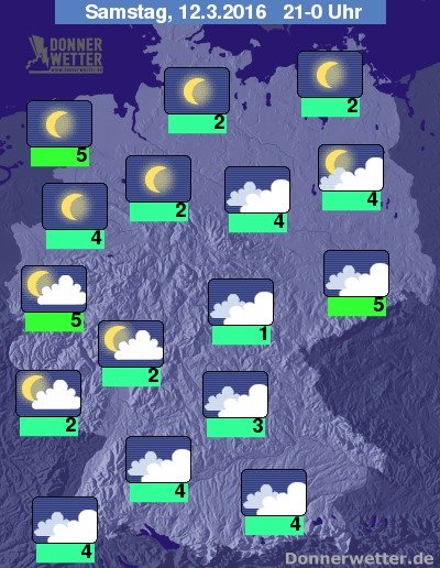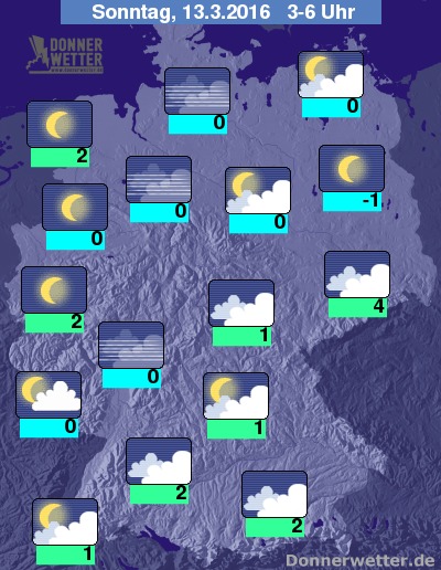 In der Nacht zum Sonntag ist es im Süden und Osten oft stark, gebietsweise aber auch aufgelockert bewölkt, am Alpenrand ist dabei zeitweise etwas Regen oder Schnee möglich, sonst bleibt es weitgehend trocken. Über der Nordwesthälfte der Republik ist der Himmel verbreitet sternenklar, hier und da können aber auch ein paar lockere Wolkenfelder durchziehen, dabei bleibt es trocken. Die Temperatur sinkt auf 4 Grad in Dresden und bis etwa -1 Grad im westlichen Brandenburg.