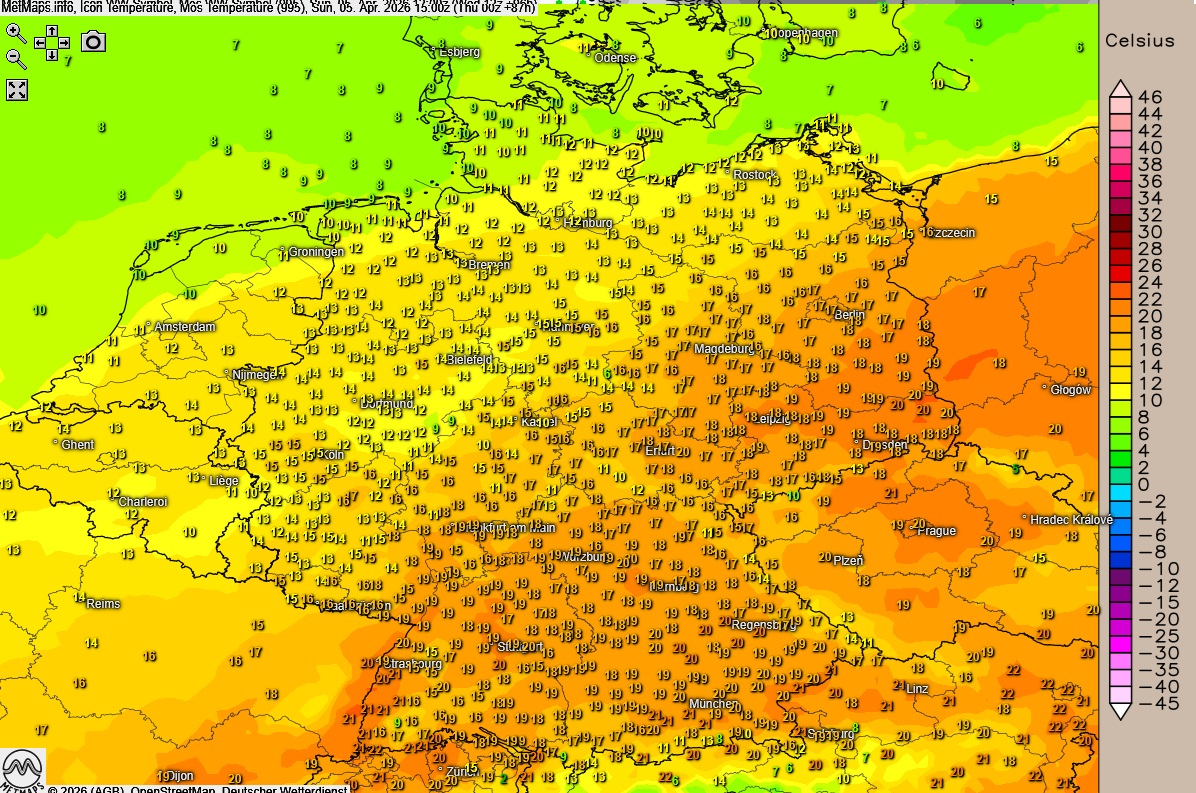 Ostersonntag im Nordern und Nordwesten einzelne Schauer, sonst heiter bis wolkig, im Süden und Südosten auch sonnig, trocken. Um 14 bis 22 Grad.