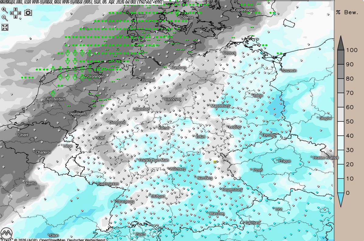 Am Ostersonntag ziehen von der Nordsee her dichte Wolken bis in die Landesmitte. Besonders im Nordwesten und Norden fällt dabei zeitweise Regen. Im weiteren Verlauf lockert es von der Nordsee her wieder etwas auf. Die Höchsttemperaturen liegen dort zwischen 11 und 15 Grad.
