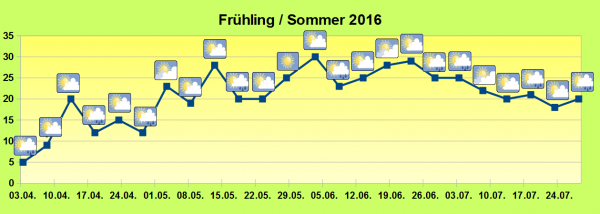 Der Mai gibt sich zunächst noch mäßig warm, dafür aber häufig heiter und trocken. Viel Sonnenschein und warme Temperaturen hat der Juni im Gepäck. Die durschnittlichen Temperaturen im Juli liegen dann wieder deutlich unter den langjährigen Mittelwerten.