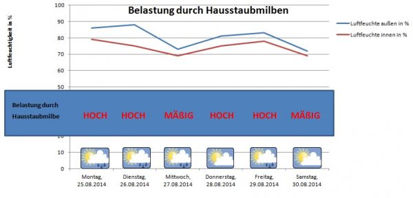 Auch im Innenraum steigt damit die Luftfeuchtigkeit stark an. Ab 65 % Luftfeuchte im Innenraum ist mit erhöhter Hausstaubmilbenbelastung zu rechnen, ab 75 % mit starker Belastung.