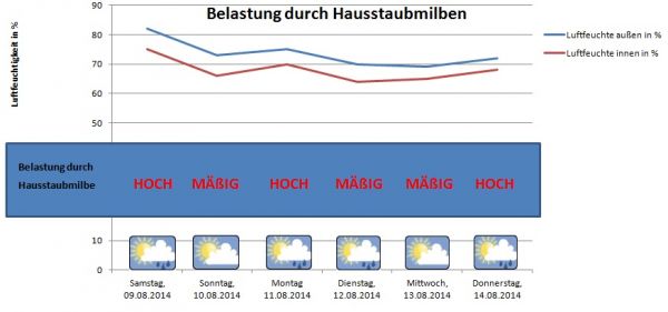 Die Außenluftfeuchtigkeit bleibt hoch, wie unsere Abbildung zeigt. Und auch die Innenraumluftfeuchtigkeit bewegt sich somit auf einem hohen Niveau. Optimale Bedingungen also für Hausstaubmilden, um Allergiker Probleme zu bereiten.
