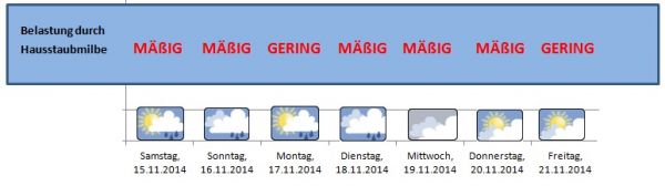In "normalen" Novembermonaten sinkt die Luftfeuchtigkeit aufgrund der kühlen Temperaturen in den Häusern auf 50 - 60 % ab; und damit auch die Belastung durch Hausstaubmilben. In diesem Jahr ist in vielen Haushalten noch eine Luftfeuchtigkeit um 70 % und mehr zu erwarten.