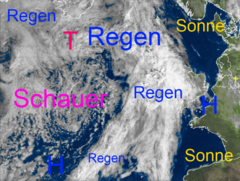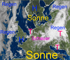 Viel Sonnenschein über Nord- und Südeuropa, dazwischen Regen- und Schauerwolken