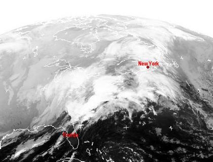Auf dem heutigen Satellitenfoto zeigen sich die Ostküstenstaaten der USA vielfach unter dichten Wolken. In einem sehr langgezogenen Band vom Norden Floridas weiter nach Norden und Nordosten, regnet es fast im gesamten Osten der Vereinigten Staaten bis zur Grenze nach Kanada und darüber hinaus. Teils sind Niederschlagsmengen von 100 Litern in 24 Stunden möglich.