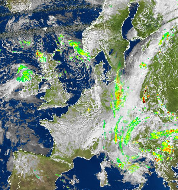 Das Satellitenbild von heute Nachmittag zeigt den europäischen Kontinent oft stark bewölkt. Tiefdruckgebiete über der Nordsee, über Polen, Ungarn, Italien und über dem Norden Skandinaviens bringen in weiten Teilen Europas unbeständiges und zeitweise nasses Wetter. Vom Osten bis in den Nordosten Deutschlands bildeten sich neben oft kräftigen Schauer auch nicht selten Gewitter. Bis zum Abend ziehen die kompakten Regen- und Gewitterwolken jedoch nach Polen und Tschechien hin ab.