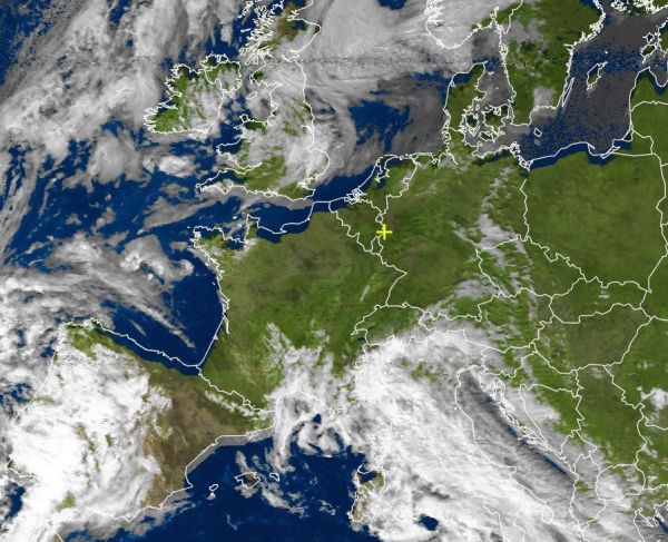 Das Satellitenbild von heute Nachmittag zeigt die Wolkenmassen des Tiefs über Italien und eines weiteren Tiefdruckgebiets vor Portugal. Unter den kompakten Wolken bildeten sich vielerorts kräftige und teils langanhaltende Regenfälle, auch einzelne, meist kurze Gewitter waren und sind weiterhin möglich.