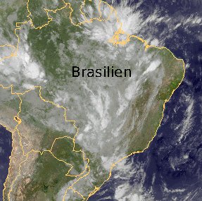 Zahlreiche Gewitterzellen findet man heute Morgen (Ortszeit) auf dem Satellitenbild von Brasilien. Besonders kräftige Zellen sind dabei an ihrer weißen Färbung auszumachen, wie etwa ganz im Westen über dem Amazonasgebiet oder im Norden im Amazonasdelta. Aber auch die schon schwächere Zelle im Süden sorgte für teils kräftige Niederschläge, insbesondere betroffen davon war die Hauptstadt Rio de Janeiro. (c) DWD/Eumetsat