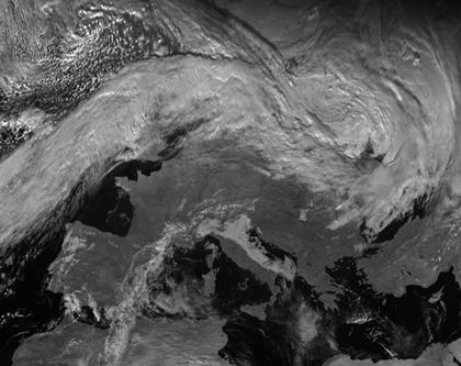 Auf dem Satellitenbild von Europa ist erkennbar, dass weite Teile West- und Südeuropas wolkenarm sind. Der Grund hierfür liegt in der Hochdruckbrücke, die sich vom Azorenhoch bis zum Hoch 'Beate' erstreckt, das sich morgen mit seinem Zentrum über dem Balkan befinden wird. Nordwestlich der Britischen Inseln ist das Wolkensystem von Tief 'Klaus' erkennbar, ebenso zeigt sich über dem östlichen Mitteleuropa noch das Tief 'Jürgen', das Norddeutschland Sturm und Regen gebracht hat. In den Alpen sind deutlich die verschneiten Berge und die schneefreien Täler zu sehen.