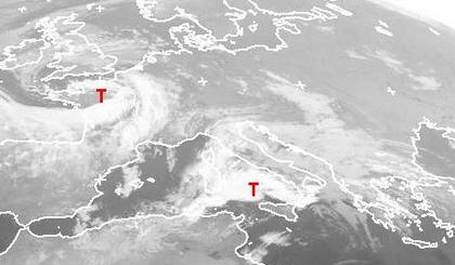 Auf dem Satellitenbild von Freitag früh sind zwei Tiefdruckgebiete gut zu erkennen. Sie sorgen heute in Westeuropa sowie rund um Italien für Wolken und Schauer, vereinzelt auch Gewitter. Von Skandinavien bis zum Schwarzen Meer bleibt es dagegen unter Hochdruckeinfluss meist freundlich. (Bildquelle: NERC Satellite Receiving Station, Dundee University, Scotland, http://www.sat.dundee.ac.uk/)