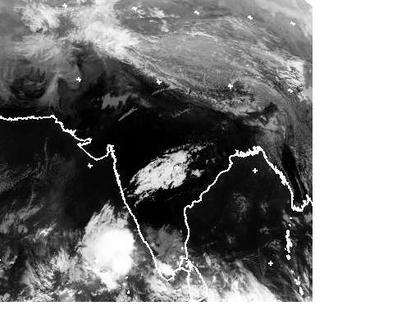 Auf dem Satellitenbild von Mittwoch früh sind Indien und die nördlicheren Regionen nahezu wolkenfrei. Gut zu erkennen ist auch der Verlauf des Himalayagebirges, dass sich mit seinen kühleren Temperaturen (im Infrarotbereich heller dargestellt) deutlich vom wärmeren Indien abhebt. (Bildquelle: NERC Satellite Receiving Station, Dundee University, Scotland, http://www.sat.dundee.ac.uk/)