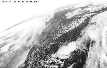 Der Ausschnitt zeigt den Kaltlufvorstoß über dem Atlantik, wo polare Luft auf breiter Front nach Süden geführt wird. An der Kaltfront hat sich ein kleines Randtief gebildet, sehr schön zu erkennen an der geschlossenen Wolkendecke.