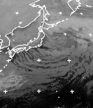 Ein Sturmtief östlich von Hokkaido bringt mit einer kräftigen Nordströmung sehr kalte Luft über das Japanische Meer nach Süden. Dabei bilden sich Schauerwolken, die vor allem auf der Nordseite der japanischen Inseln Schneefall bringen.