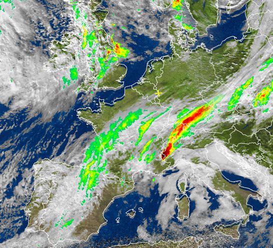 Das Satellitenfoto von heute Nachmittag zeigt ein kräftiges Niederschlagsgebiet, das sich in einem Streifen von den französischen Seealpen, quer über die Schweiz bis nach Süddeutschland hin erstreckt. Hier kam es in den Nachmittagsstunden zu teils kräftigen Regen, in den Alpen ab etwa 1500 m zu teils kräftigen Schneefällen.