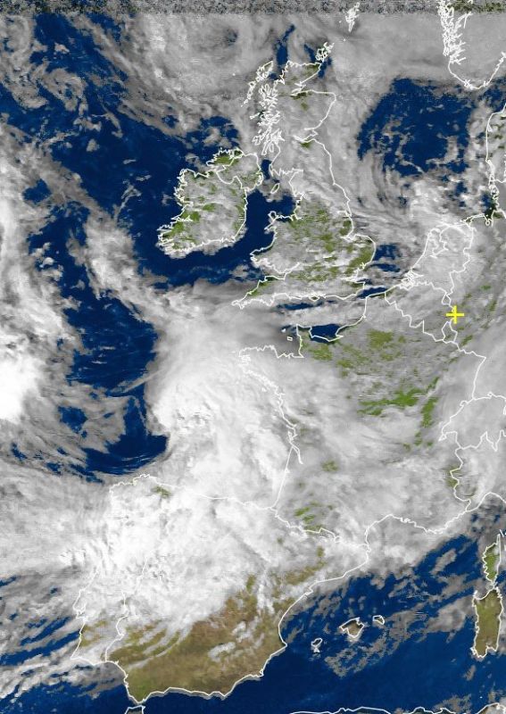 Auf dem Satellitenbild von heute Nachmittag sind über weiten Teilen der Iberischen Halbinsel und über Frankreich sehr kompakte und hochreichende Wolken zu erkennen, sie gehören zu einem Tief mit Kerndruck über der Biskaya und sorgen vielerorts auch für kräftige, langanhaltende und ergiebige Niederschläge in den Regionen.