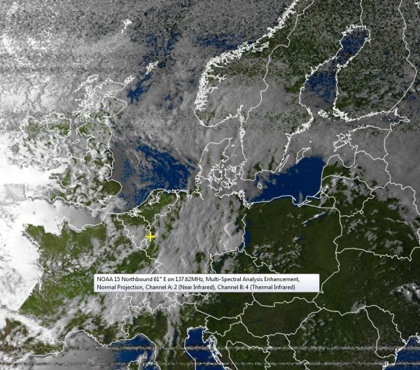 Auf dem Satellitenbild von Dienstag Nachmittag ist ein sehr breites Wolkenband zu erkennen, das sich von den Alpen, über große Teil von Deutschland und bis weiter nach Skandinavien erstreckt, hierbei handelt es sich u.a. um die Luftmassengrenze, die trockenheiße Luft im Osten und Südosten Europas von deutlich kühlerer und oft feuchter Luft im nordwestlichen Europa trennt. Unter den dichten Wolken fiel dabei oft auch kräftiger, ergiebiger und gewittriger Regen.