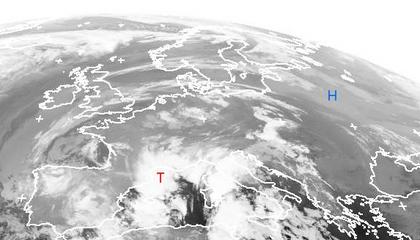 Auf dem heutigen Satellitenfoto zeigt sich ein kräftiges Tief über dem nördlichen Mittelmeer. Es sorgt fast im gesamten nördlichen und westlichen Mittelmeerraum für teils kräftige Schauer und Gewitter. In den übrigen Gebieten Europas ist es dagegen meist ruhig und trocken, allerdings hält sich den Tag über vielerorts dichter Nebel oder Hochnebel oder es ist stark bewölkt.