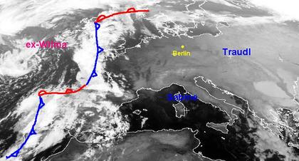 Das Frontensystem des Tiefs 'ex-Wilma' über dem Atlantik erstreckt sich auf dem Satellitenbild vom Sonntagmorgen von den Britischen Inseln bis zur Iberischen Halbinsel, vor allem in Portugal kann es kräftige Niederschläge geben. In weiten Teilen Mittel- und Osteuropas sorgt das Hoch 'Traudl' über Westrussland für ruhiges, teils trübes, teils sonniges Wetter.