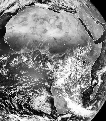 Bis auf einige Schauerwolken durch Tiefdruckeinfluss über dem Mittelmeer findet man im Norden Afrikas derzeit kaum Wolken. Die Bewölkung zahlreicher Tropischer Schauer und Gewitter mit teils ergiebigen Regenmengen erstreckt sich nun, im Südsommer, über die Südhälfte des Kontinents.