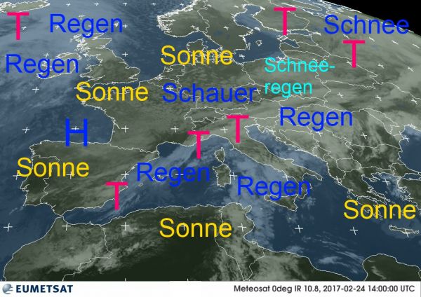 Das Satellitenfoto von heute Nachmittag soll uns zeigen wo in Europa die Sonne scheint und wo es regnet.