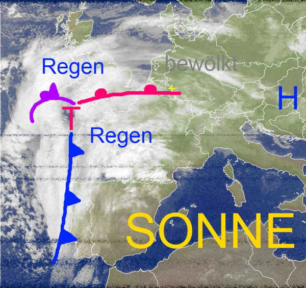 Das Satellitenfoto von heute zeigt uns eine Warmfront, die den Westen und Nordwesten von Deutschland mit dichteren Wolken und etwas Regen streift. Hinter ihr gelangt von Süden sehr milde Luft nach Deutschland. Die Temperaturen können morgen örtlich bis nahe 20 Grad klettern.