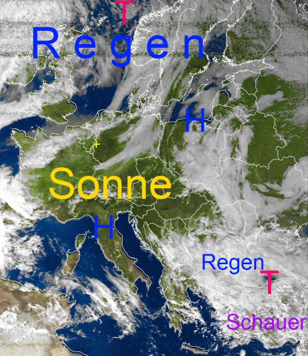 Über Deutschland erkennt man zwar einen Wolkenstreifen. Jedoch handelt es sich hierbei meist nur um hohe und mittelhohe Wolkenschleier, durch welche die Sonne noch hindurch scheinen kann. Ganz im Norden ist jedoch von der Nordsee ein schmales dichteres Bewölkungsband herein gezogen. In Schleswig-Holstein und Hamburg fiel daraus örtlich ein wenig Regen oder Sprühregen.