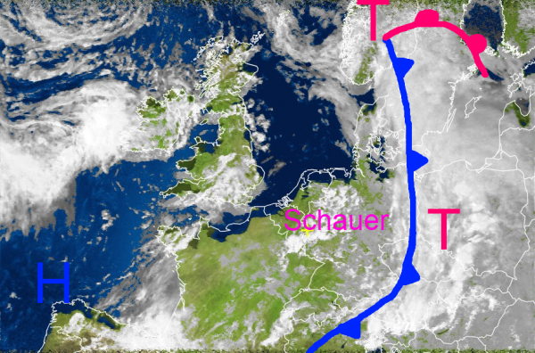 Hinter der nach Osten abziehenden Kaltfront wurde die schwül-warme Luftmasse der vergangenen Tage durch erfrischende Atlantikluft ersetzt. Hinter der Front hat die Höhenkaltluft im Westen eine Schauerzone produziert, die in den nächsten Stunden nach Osten vorankommt und für örtliche Regengüsse sorgen wird.