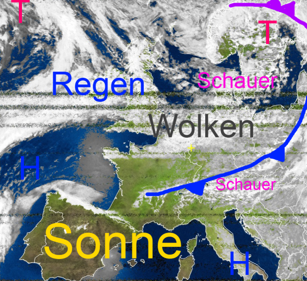 Mitteleuropa bildet die Grenze zu einem wolkenreichen und teilweise regnerischen Norden und Nordwesten von einem wolkenarmen und sonnigen Süden.