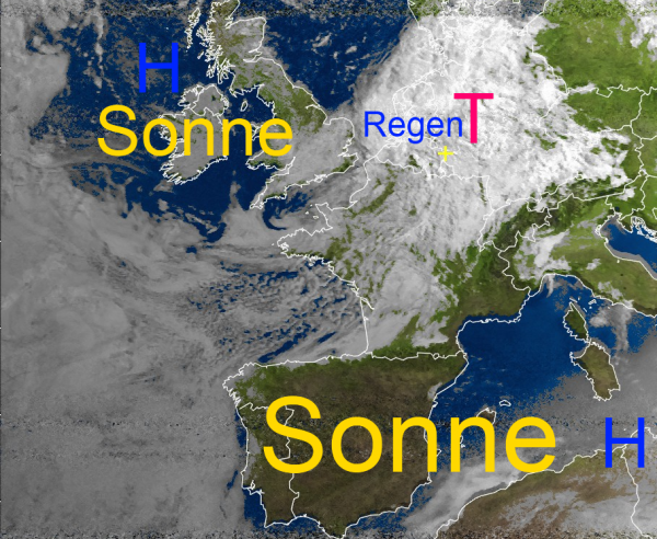 Morgen legt sich der wolkenärmere Bereich des Hochs bei Irland über Mitteleuropa und lässt verbreitet die Sonne scheinen. Damit heizt sich die Luftmasse tagsüber wieder auf.