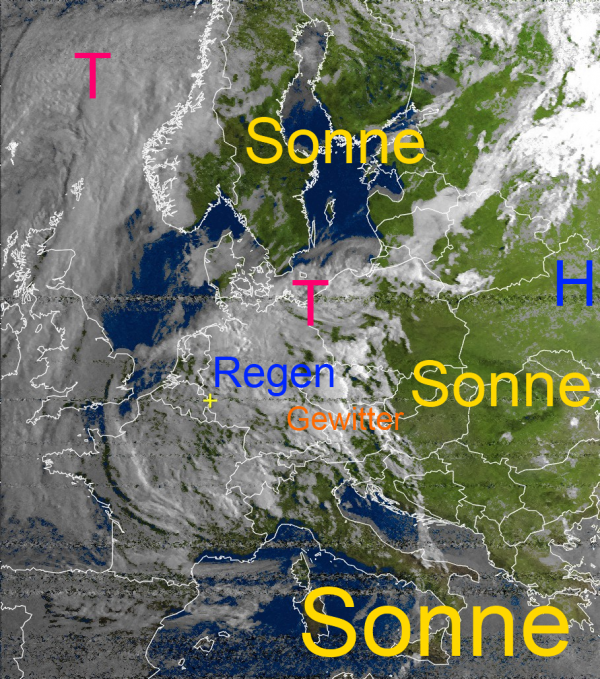Über Mitteleuropa dreht weiterhin ein Tief munter seine Kreise und versorgt Teile Deutschlands mit Regenwolken. Vor allem im Osten mischen auch Blitz und Donner mit. Die auftretenden Regenmengen sind regional weiterhin sehr kräftig und sorgen für kleinräumige Überflutungen, sowie Aquaplaning auf den Straßen.