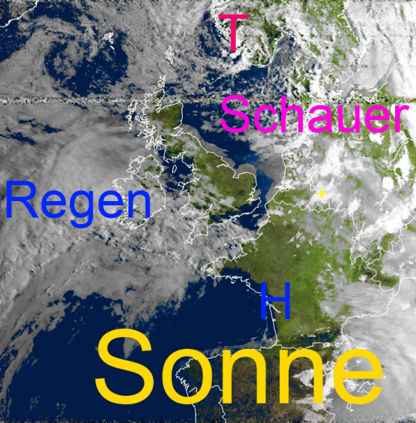 Freundliches Wetter mit reichlich Sonnenschein gibt es im Bereich des Hochs über Südwestfrankreich und Spanien. Dazu herrscht im Landesinnern von Spanien große Hitze bis örtlich 40 Grad.