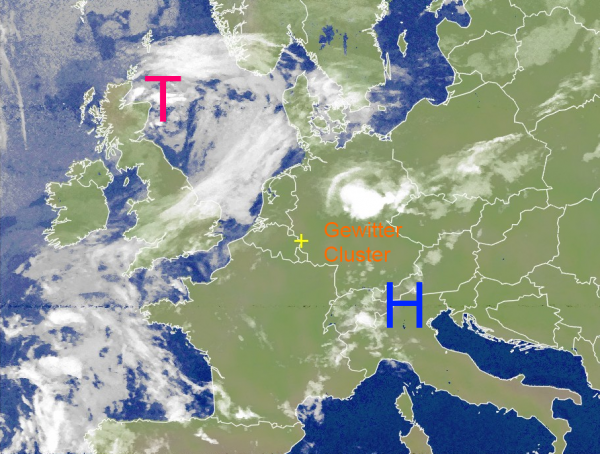 Im Bereich dieser Luftmassengrenze, die Deutschland von einem angenehm temperierten Norden zu einem sehr warmen und schwülen Süden trennt, können sich im Tagesverlauf wieder neue Schauer und Gewitter entwickeln.