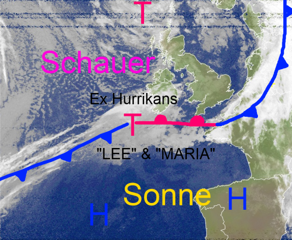 Das südwestlich von Irland liegende Randtief, bestehend aus den beiden Hurrikans "LEE" und "MARIA" rauscht über Nacht über die Südhälfte Deutschlands hinweg und bringt gebietsweise ergiebigen Regen. Zum Teil können über 25 Liter Niederschlag auf den Quadratmeter fallen. In der kühlen Polarluft über dem Atlantik haben sich wabenförmige Schauerwolken gebildet, die am morgigen Feiertag in Deutschland für wechselhaftes Wetter mit örtlichen Schauern sorgen werden.